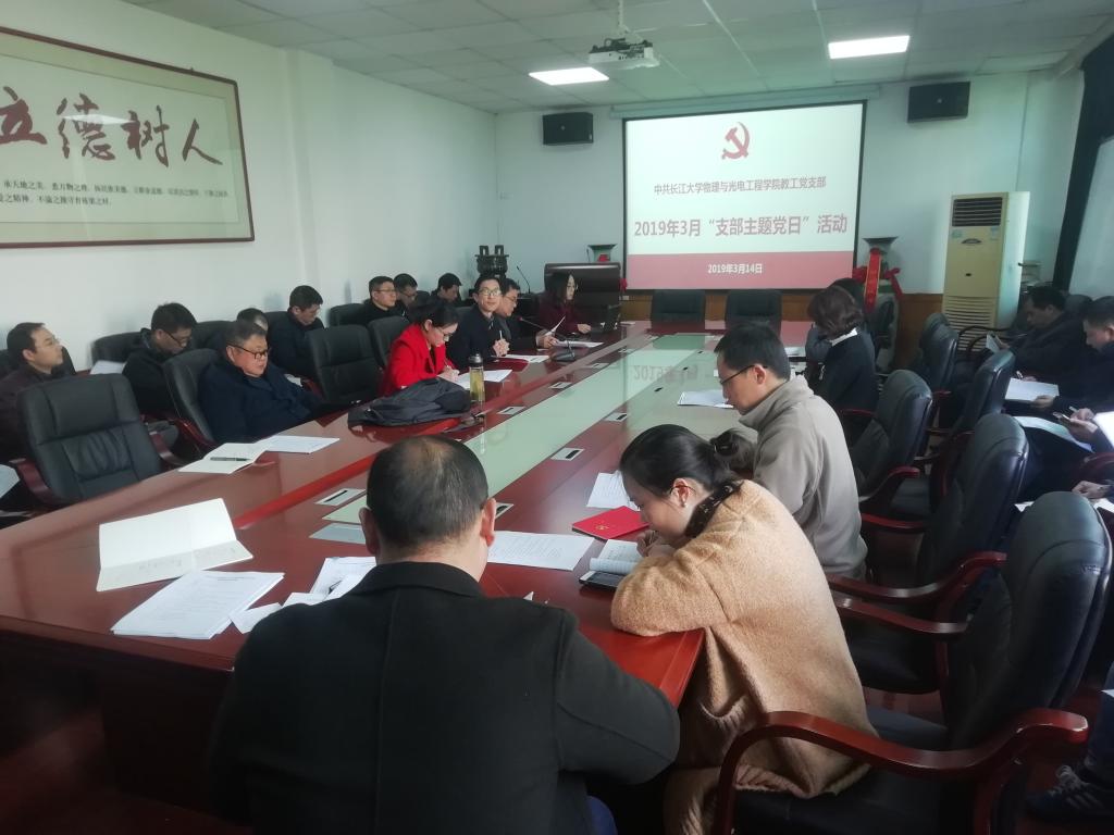 3月14日下午,根据学校党委政治理论学习安排,顶级在线体育平台党委组织教工党支部、学生支部党员开展了3月支部主题党日活动,活动分为:重温入党誓词、学习重要讲话和文件精神、观看先进典型事迹和讨论交流等4个部分。教工第一党支部和教工第二党支部于下午14:30在10教306开展主题党日活动,学生党支部于下午16:30在10教306进行。