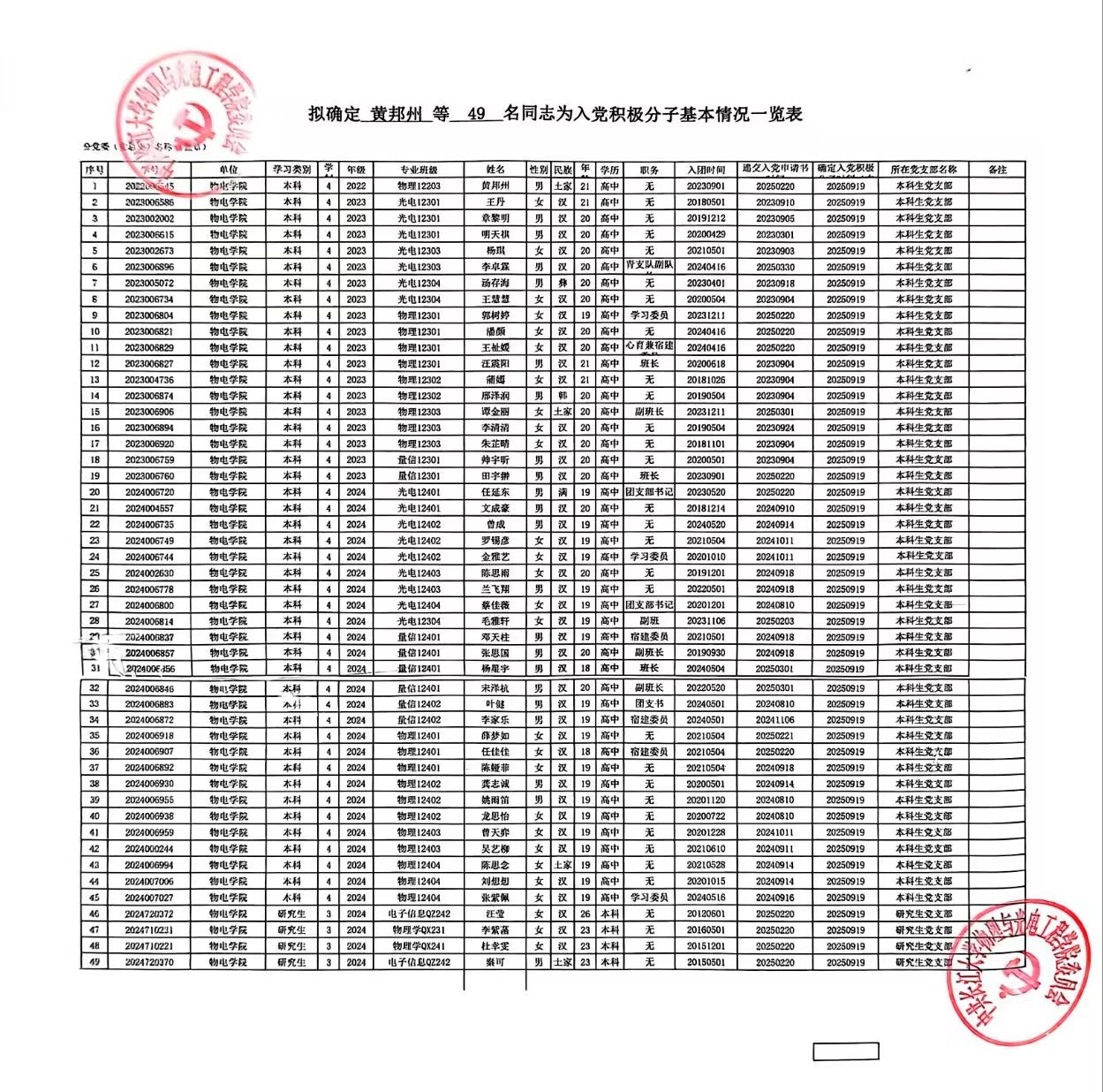 根据党员推荐和团组织推优情况,经支部委员会会议讨论决定并报顶级在线体育平台党委备案,确定 黄邦州 等 49 名同学为入党积极分子,现予以公示。公示时间: 2025 年 9 月19日至 2025 年 9 月25日。