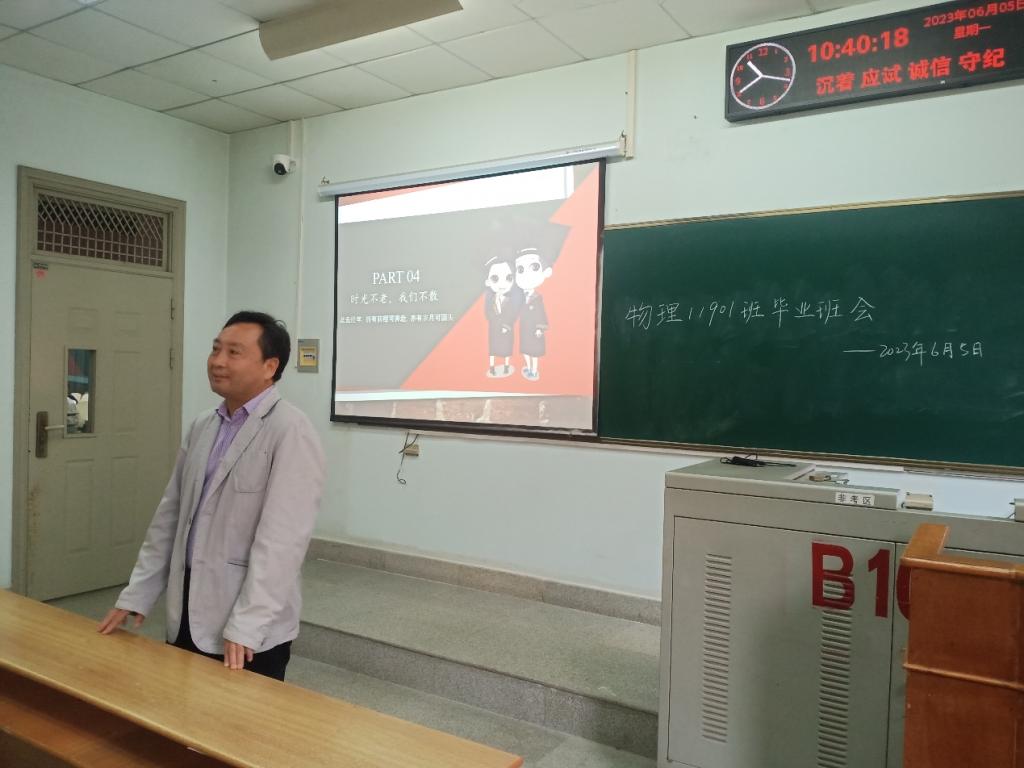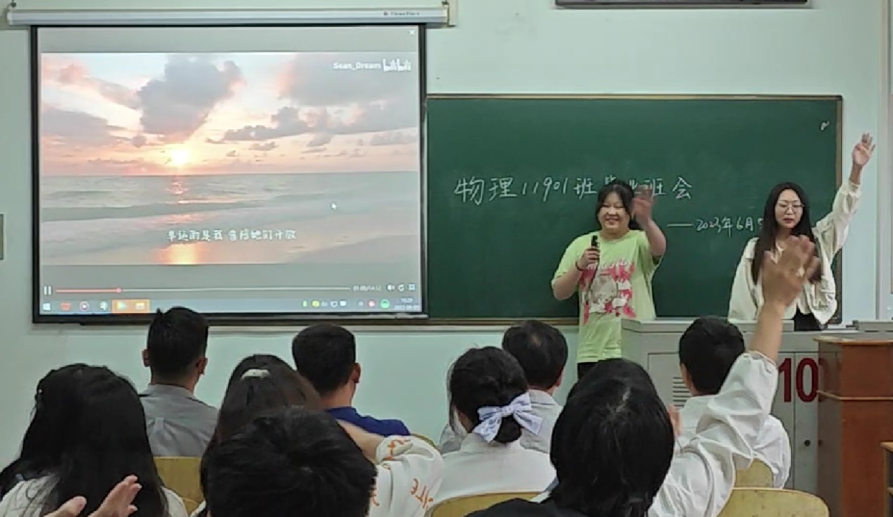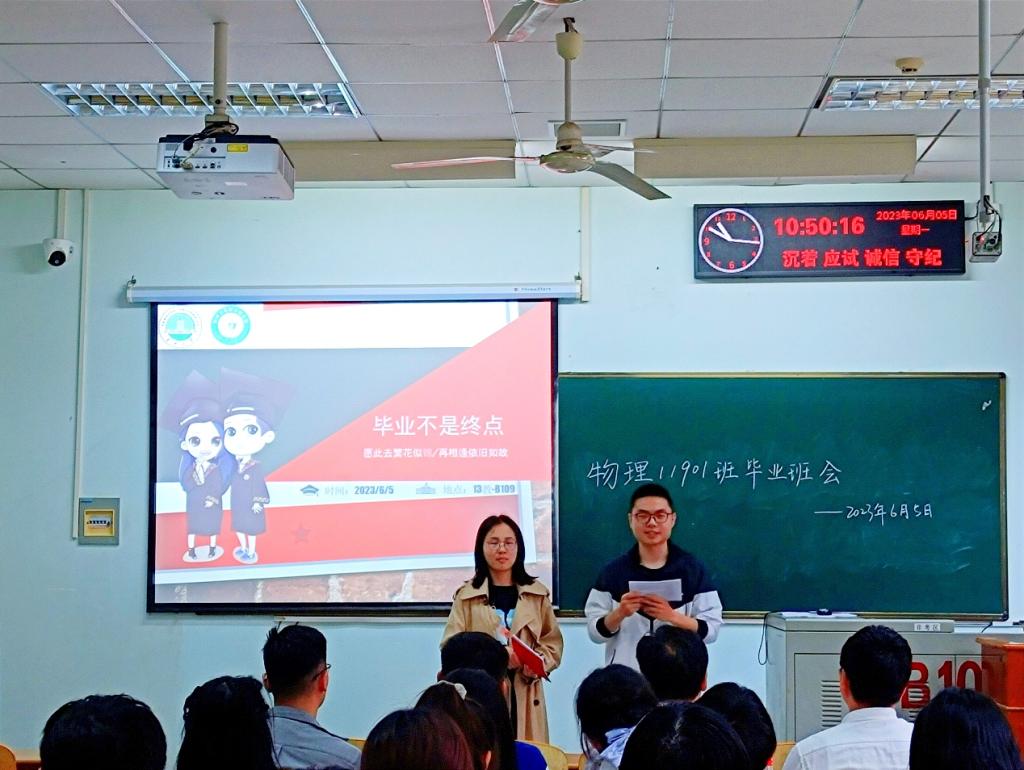 (通讯员 汪庆龙)2023年6月5日,物理与光电工程学院物理11901班辅导员、班主任为2019级毕业班召开以“毕业不散场,青春不留白”为主题的最后一次班会,共同回忆青葱四年,展望未来,为新篇章的开启许下美好祝愿。