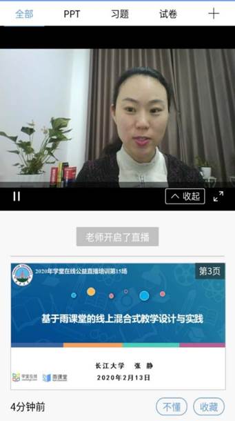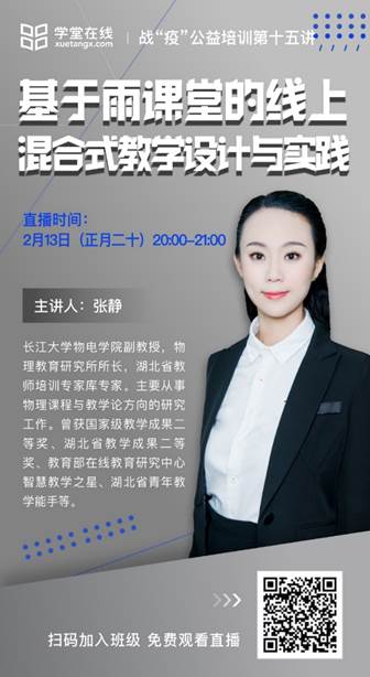 为进一步有效防控新型冠状病毒感染的肺炎疫情,落实教育部“停课不停学”的通知精神要求,清华学堂在线战“疫”公益培训邀请了物理与光电工程学院张静博士,于2月13日通过雨课堂直播的方式做了《基于雨课堂的线上混合式教学设计与实践》的报告。