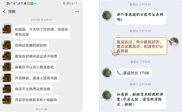 孙利辉一向注重教学改革和研究,对雨课堂等智慧型教学工具也有所接触。她充分考虑到学生的网络和电脑等实际情况,为达到最佳效果,她改用音频直播,并针对本科生、研究生不同课程要求和内容重新组织教学内容和修改教学设计,每隔三四张幻灯片就借用投票题与学生互动一下,督促他们学习;每隔半小时就让学生休息一下,放松一下眼睛,缓解一下情绪。为了增强和学生互动的教学效果,她又通宵达旦反复测试,将雨课堂和腾讯会议平台结合起来进行远程教学。由于教学效果好,2月14日晚上十点半学院突然通知她第二天早上讲授在线教学示范课,她采用雨课堂和腾讯会议平台直播获得了领导和学生们的一致肯定,不少同事纷纷向她咨询在线教学过程中遇到的问题及解决办法,她都热情地进行了回复。