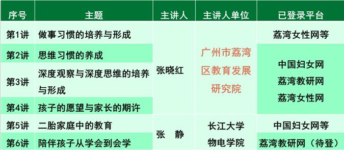 物理与光电工程学院张静副教授与广州市荔湾区教育发展研究院张晓红正高级教师联合打造了《生活即教育》系列公益讲座,该系列讲座已完成6讲录制,并已有4讲登录中国妇女网,得到了中国妇女网主编的高度认可。其中张静老师主讲了第5讲“二胎家庭中的教育”和第6讲“陪伴孩子从学会到会学”,第5讲已分别登录中国妇女网、长江大学家文化云上微分享和荔湾教研网,通过不同平台让全国的家长们来关注二孩家庭中的实际问题。
