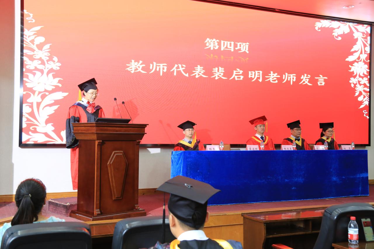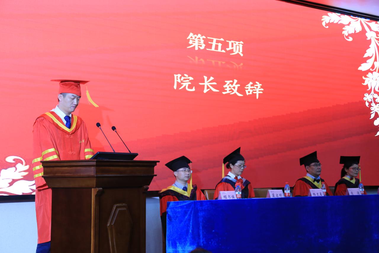 学院院长杨文星教授致辞,寄语毕业生。首先,他向全体毕业生致以最热烈的祝贺和最美好的祝福,感谢师长的辛勤培养和默默奉献;“世界在变,社会也在变,面对不可预知的前途,你们该怎么办?你们应该在成长中选择坚守。”同时向毕业生们提出了期望,希望物电学子不仅要有能力,更要有操守,心怀感恩、勇于担当、恪守底线、慎始敬终、格物穷理,扬帆起航。