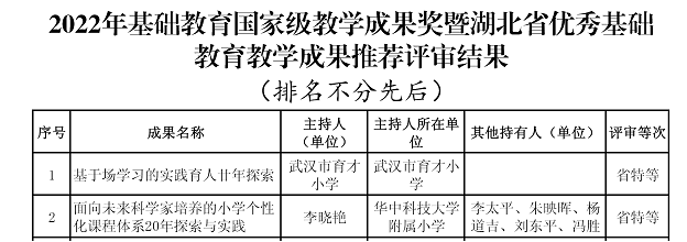 湖北省基础教育教学成果奖属于教学成果奖的三大领域(高等教育、基础教育、职业教育)之一,由湖北省教育厅主办,每四年评审一次,是湖北省在基础教育教学研究和实践领域中颁授的最高奖项,代表了本省基础教育教学工作的先进水平和重大进展。本次基础教育教学成果奖共评选出特等奖13项,一等奖51项,二等奖58项。近年来,我院不断深化教育教学改革,持续推进教学质量工程,切实把党的教育方针和立德树人的根本任务落实到教育教学的全过程,不断推进教育教学理论的研究,注意教育教学成果的积累和应用。经过不断完善和修改申报资料,最终顺利完成了申报工作。