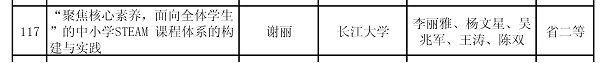 近日,湖北省教育厅公布了2022年基础教育国家级教学成果奖暨湖北省优秀基础教育教学成果奖的评审结果。我院谢丽博士主持的项目《“聚焦核心素养,面向全体学生”的中小学STEAM课程体系的构建与实践》荣获二等奖。实现了长江大学合并建校以来的历史性突破,首次斩获基础教育省级教学成果奖。