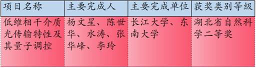 3月16日,2023年湖北省科技创新大会在武汉隆重举行,长江大学科研工作取得重大突破,共有9项成果获2022年度湖北省科学技术奖。以第一单位获奖的6项成果中,我院杨文星教授牵头的《低维相干介质光传输特性及其量子调控》科技成果,获2022年度湖北省自然科学二等奖,这也是长江大学本年度所获成果奖中唯一一项湖北省自然科学奖,也是我院湖北省科技奖励历史性的突破。