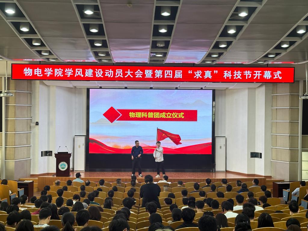 副院长龚小龙宣读物理科普团成立文件,公布首批成员名单,并为科普团授旗,由物理科普团负责人量信12201班刘可俊接旗。