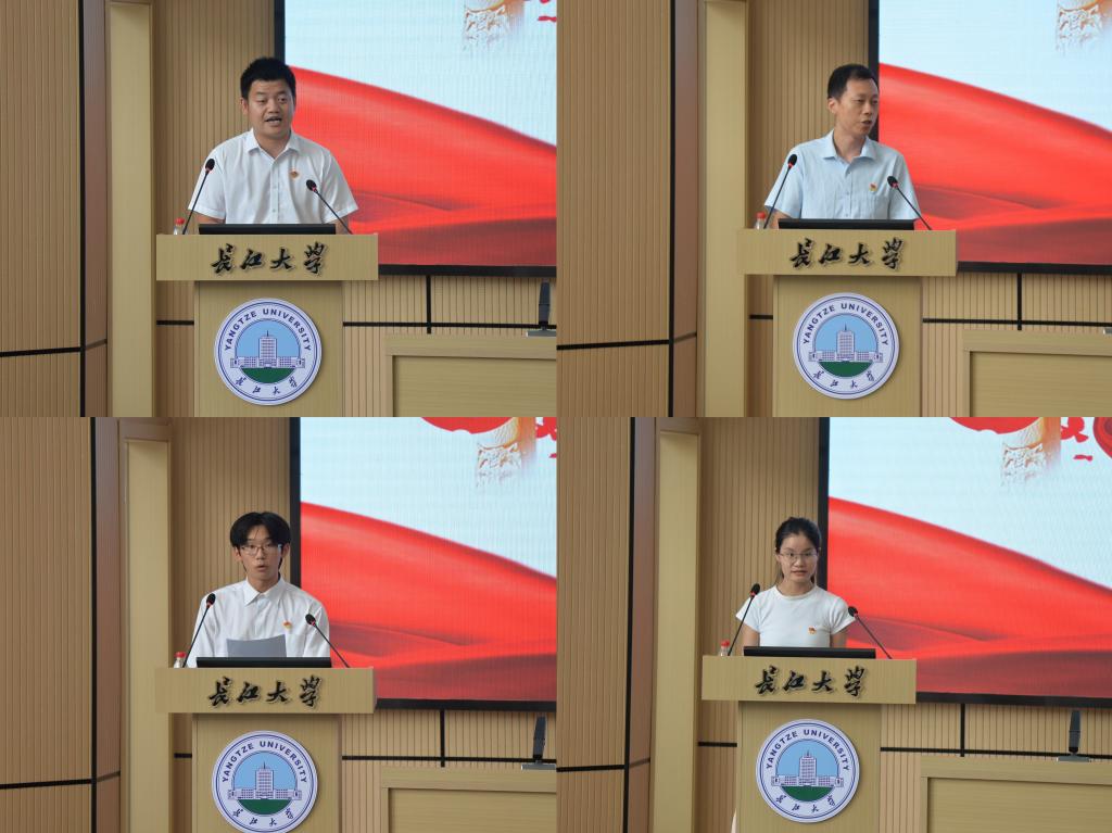 新发展学生党员代表常奕飞、毕业生党员代表罗选雪、新发展教师党员代表水涛、教师党员代表李松依次上台交流发言,分享了在学习和工作中的点滴感悟及入党的心路历程,表示将继续发挥先锋模范作用,用实际行动践行入党誓言。