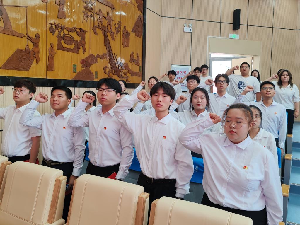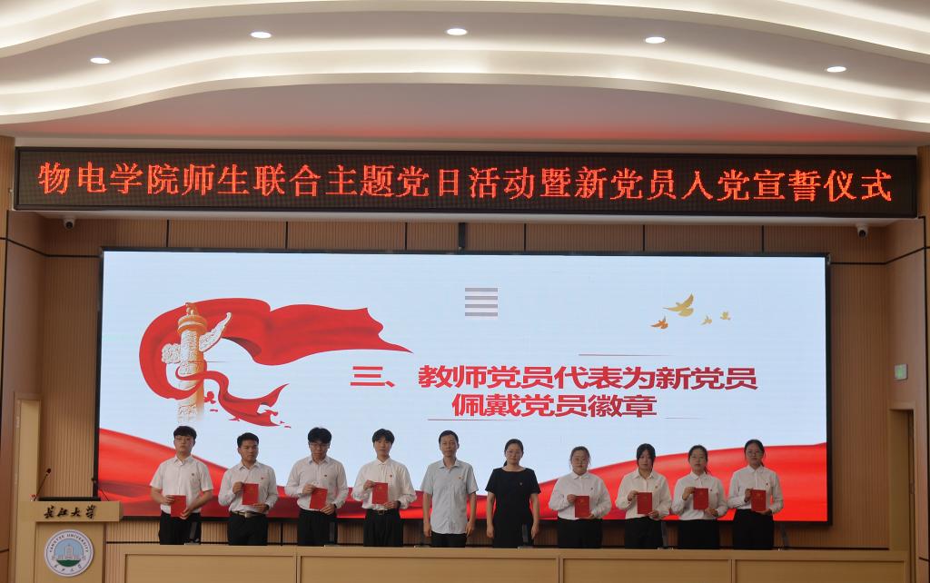 活动在激昂的《国际歌》中拉开序幕,学院党委委员、副院长龚小龙宣布新发展党员名单,教师党员代表为新党员佩戴党员徽章。