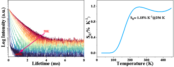 文章首次采用高温固相反应法合成了新型 CaSrInTaO6:Mn4+ 双钙钛矿荧光粉,并通过 XRD 和 XPS 等技术对其晶体结构和组成进行了表征。研究发现,该荧光粉在 373 nm 激发下发出深红色光,且具有较强的热猝灭特性,使其在荧光寿命测温领域具有潜在应用价值。文章进一步研究了荧光寿命随温度变化的规律,并计算了其绝对灵敏度、相对灵敏度和温度不确定度等参数,结果表明该荧光粉具有优异的温度传感性能,有望成为一种新型的非稀土荧光测温材料。
