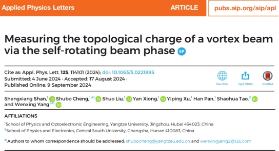 近日,K云体育官方入口湖北省创新群体团队在新型结构光场调控领域取得新进展,相关成果以“Measuring the topological charge of a vortex beam via the self-rotating beam phase”为题发表在物理类权威期刊《Applied Physics Letters》(AIP Publishing,中科院SCI二区)上,长江大学为第一单位,我院程书博副教授和杨文星教授为通讯作者。同时该论文因其对相关领域的重要参考价值,受到同行及编辑的好评,被评选为“Editor's Pick”(Editor's Picks serve to highlight articles with excellent scientific quality and are representative of the work taking place in a specific field.),并在官网配发推荐短文加以重点展示。