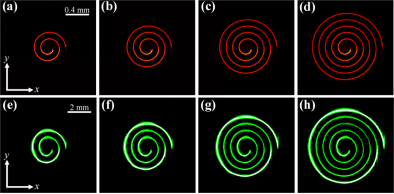 该课题组提出了一种可控多螺线光束,它可以通过锥透镜相位调制的helico-conical相位产生。论文对多螺线光束的焦场强度分布进行了理论和实验研究。基于局部空间频率的近似映射,讨论了多螺线光束两相邻子光束之间的相对距离。结果表明,两相邻子光束之间的相对距离与两子光束的径向因子梯度Δα呈线性关系。当径向因子梯度Δα等于一个临界值(即Δαc)时,多螺线光束可变为阿基米德螺线形光束。此外,论文还讨论了拓扑电荷l与临界径向因子梯度Δαc的关系。结果表明,临界径向因子梯度Δαc与拓扑电荷l呈线性关系。可控多螺线光束在三维光学微操控和信息传输中具有潜在的应用前景。