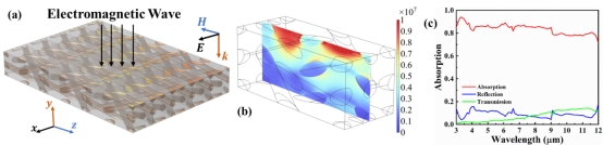 图2. (a) 增强材料光学模拟的3×3阵列 (b) 在3.3 μm处的电场截面 (c) 增强材料光学响应。