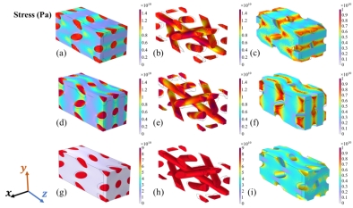图1. (a)-(c) x方向加载下的应力分布 (d)-(f) y方向加载下的应力分布 (g)-(i) z方向加载下的应力分布。