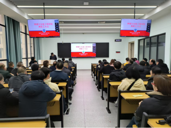(通讯员 梁军)3月13日下午,物电学院在16教B101教室召开全院教职工大会,部署近期重点工作。学院领导班子成员、全体教职工参加会议。会议由院党委书记凌新华主持。