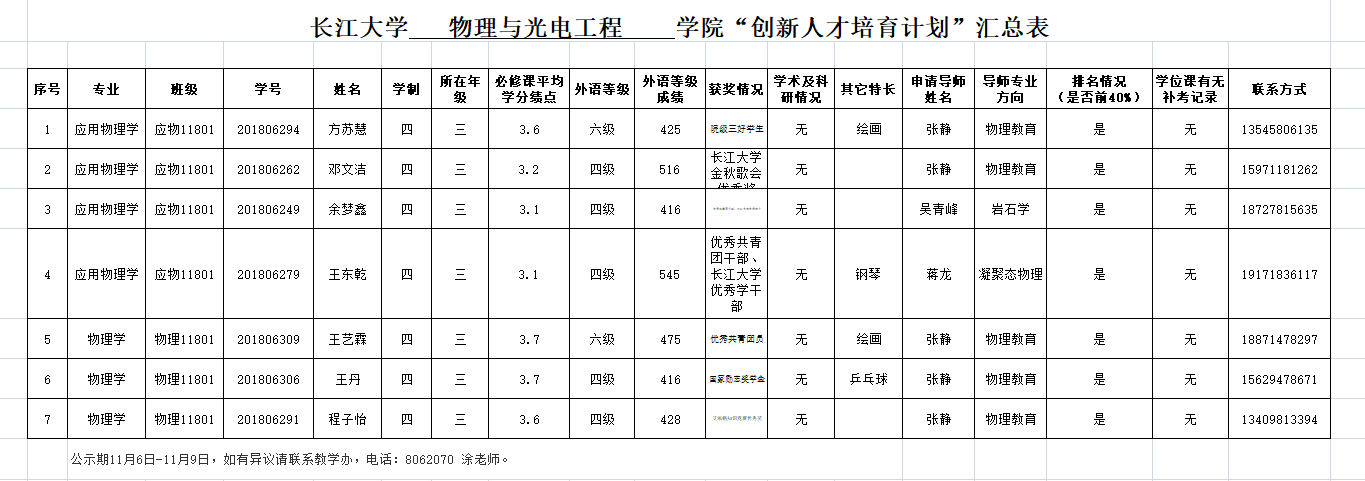物理与光电工程学院“创新人才培育计划”公示