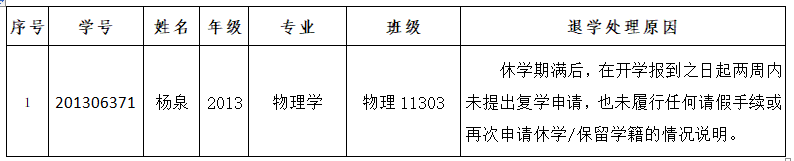根据《普通高等学校学生管理规定》(教育部令第41号)第三十条和《长江大学普通本科生学籍管理办法》(长大校发〔2017〕134号)第五十一条规定,对达到退学处理条件但拒绝办理退学手续的本科生,现以公告方式送达拟退学处理告知书,公告时间7个工作日,于2021年5月12日结束公告。在公告期内,学生可向学院提出申辩和书面陈述并署真实姓名、联系方式,邮寄或直接送到物理与光电工程学院教学办;未在规定时间内提交申辩和书面陈述者,视为放弃陈述、申辩的权利。公告期满后,学院将按学校规定办理。