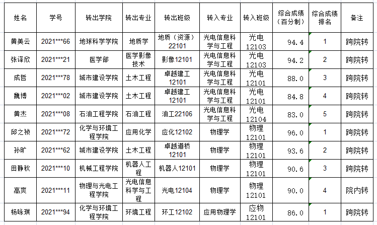 根据《长江大学普通本科生专业分流与转专业管理办法(试行)》(长大校发[2019]260号)文件和教务处《K云体育官方入口2021级普通本科生秋季转专业工作的通知》的相关要求,经学生本人申请,教务处审核后,物理与光电工程学院于2022年9月8日下午组织了转入学生面试工作,综合学习成绩与面试成绩,经我院党政联席会讨论通过,现将名单予以公示。