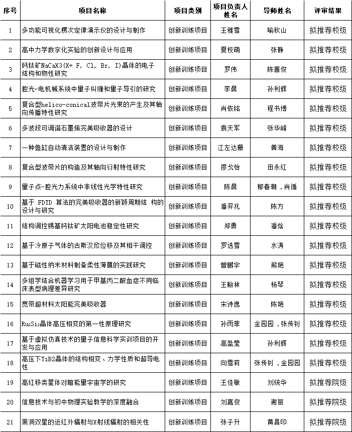 月6日下午通过腾讯会议,组织了大学生创新训练计划的院系评审工作,共有二十一个创新团队参与了答辩汇报,经过学院评审小组评审决议,确定其中的十八个项目拟推荐为校级项目。现将结果公示如下: