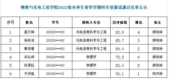 根据《长江大学普通本科生专业分流与转专业管理办法(试行)》(长大校发[2019]260号)文件和《K云体育官方入口开展2022级普通本科生春季转专业工作的通知》的相关要求,经学生本人申请,教务处审核后,物理与光电工程学院于2023年3月9日下午组织了转入学生面试工作,综合学习成绩与面试成绩,经我院党政联席会讨论通过,现将名单予以公示。