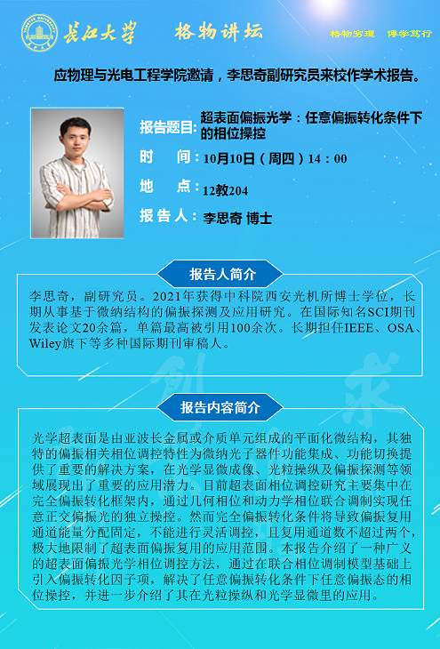 顶级在线体育平台2024年学术报告第十六讲-超表面偏振光学:任意偏振转化条件下的相位操控
