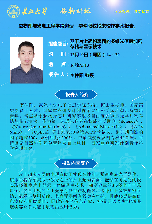 顶级在线体育平台2024年学术报告第二十五讲-基于片上超构表面的多维光信息加密存储与显示技术