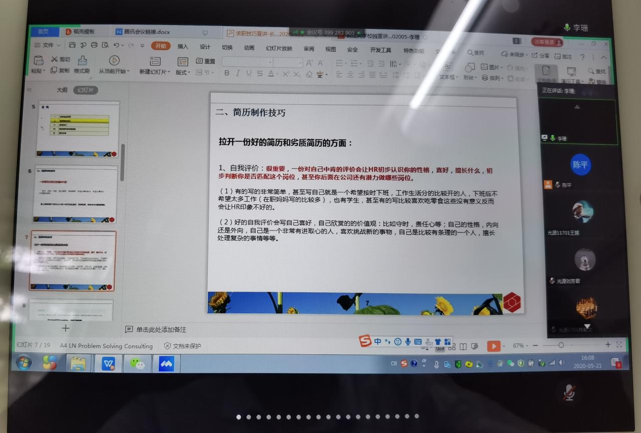 5月21日下午4:00,顶级在线体育平台邀请到了武汉光至科技有限公司HR李珊讲师为2020届毕业生及2017级应用物理学、物理学、光源与照明专业学生作求职讲座,讲座的主题是“求职技巧分享”,活动以腾讯会议方式进行,学工办陈平老师主持本次会议。