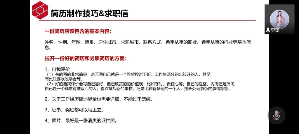11月25日下午3:00,受物理与光电工程学院邀请,武汉光至科技有限公司人事总监、总经理助理李珊,通过腾讯会议为毕业生作题为“职业素养”的专场讲座。就业专干陈平老师以及60余名毕业生参加了本次讲座。