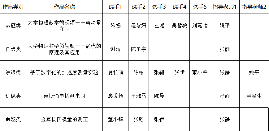 根据第九届全国大学生物理实验竞赛的章程要求:每个学校最多5支队伍,每支队伍参赛指导教师不得多于2人,学生不得多于5人,其中讲课比赛项目只限主讲学生个人参赛。每所高校报名时,第一、二竞赛类别每类最多3支队伍,第三竞赛类别最多2支队伍。综合各个报名队伍的申报书、视频、PPT及实物展示表现,推荐以下5支队伍参加全国赛: