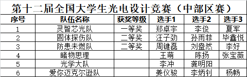 7月14日,第十二届全国大学生光电设计竞赛(中部区赛)在武汉纺织大学落下帷幕。本次大赛以“光电引领 未来可期”为主题,来自安徽、江西、河南、湖南、湖北中部五省60余所高校的538支队伍、近2000名师生报名参赛,210支参赛队伍成功晋级到线下赛的激烈角逐中,经现场展示、答辩、评审专家提问等环节,本届大赛共产生了一等奖78项,二等奖131项,三等奖148项。我院共推荐6支队伍参赛,最终获得一等奖1项,二等奖2项。