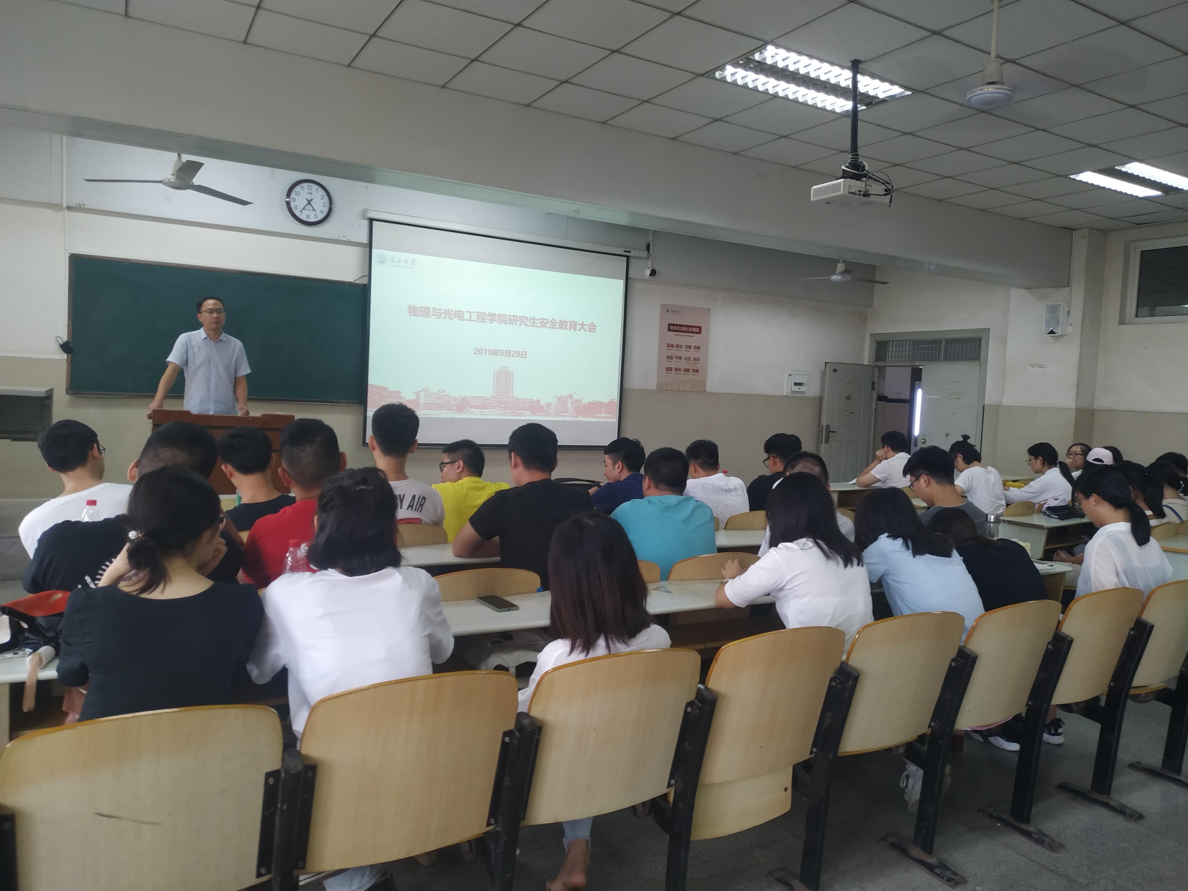 (通讯员 张欣欣)安全工作一直是学院管理工作的重中之重。在十一来临之际,为贯彻落实学校安全教育要求,增强学生安全意识,提升学生安全防范手段,物理与光电工程学院于2019年9月29日下午4点在12教104召开研究生安全教育大会。参加本次大会的有研究生辅导员陈平老师以及顶级在线体育平台全体在校研究生。