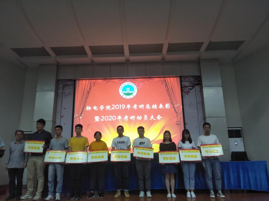 大会第一项,学院副院长熊艳宣读学院2019年硕士研究生入学考试先进个人、集体,湖北五方光电校企合作奖学金,以及2018―2019学年优秀实习生的表彰文件。大会第二项:颁奖。院长田永红、分党委书记杨克非、光电系主任李继军分别为考研明星、考研先进寝室、考研先进班级,2019年湖北五方光电校企合作奖学金获奖学生以及2019届优秀实习生代表颁奖并合影留念。