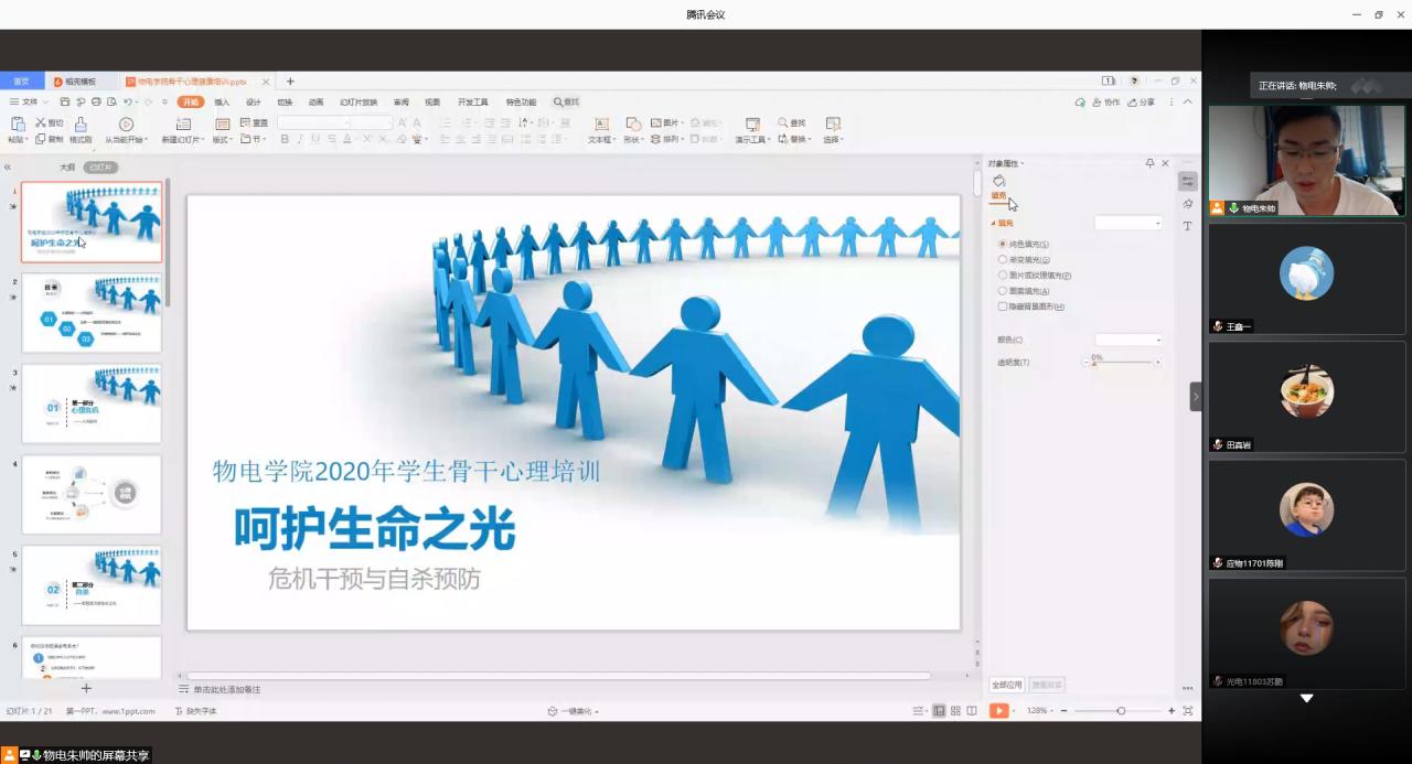 应学校要求,为深入加强我院心理服务建设,帮助学生培育自尊自信、理性平和、积极向上的社会心态,加强疫情后大学生的心理健康教育,我院开展了2020年学生骨干心理培训工作。本次培训工作线上开展,主讲人为心理专干朱帅老师。