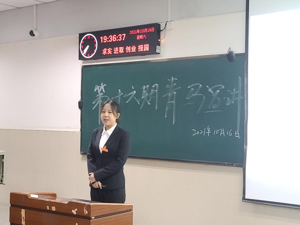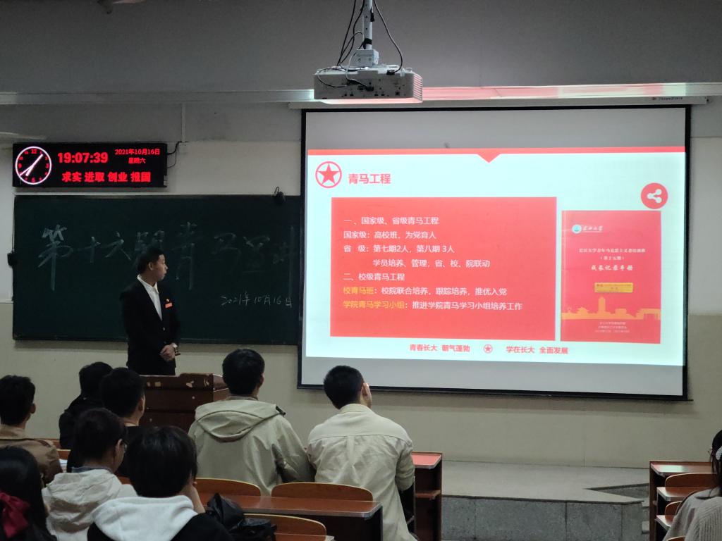 宣讲会主要围绕“它是什么”、“它做什么”、“它为什么”三个层面进行。由14期青马学员楚定祥做总体汇报,让同学们了解青马班的文化理念、培养目标、培养内容。随后全体学生共同观看了青马宣传视频,更加直观的感受到青马班的活动风采。青马15期学员牛芊芊、张华、冯道兴就“为什么”这一层面向同学们介绍青马班对于个人具体的收获与成长。