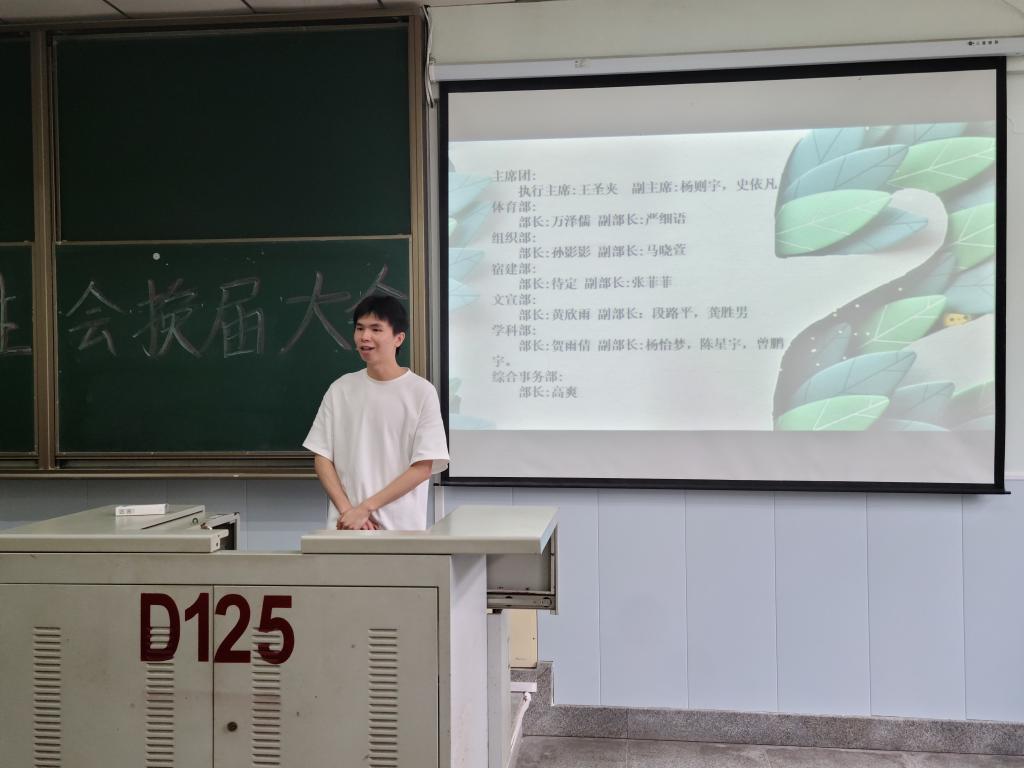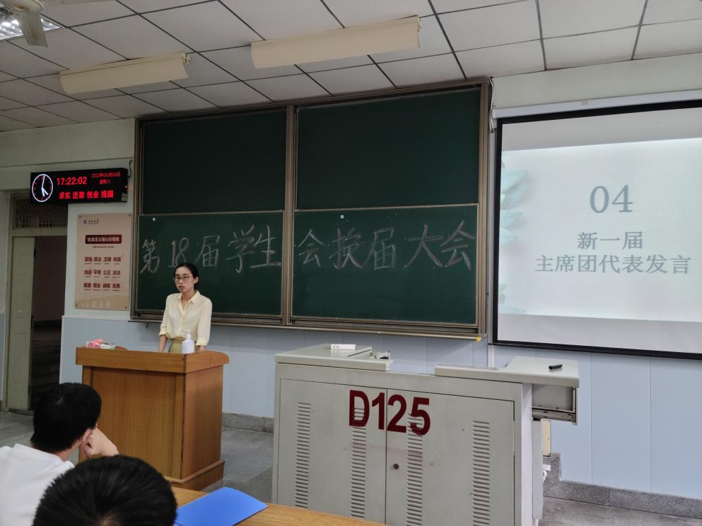 大会伊始,各部门负责人进行工作总结,总结了各个部门的学年工作完成情况与不足,以及对下一届部门负责人的建议。其后,黎俊宏主席作为18届主席团代表上台致辞,总结了本届部门改革进展与本届学生会工作的长处以及不足并对下一届留任成员提出建议,紧接着新一届学生会主席王圣夹发表讲话,提出了强化内部建设与工作开展分工两点蓝图规划。