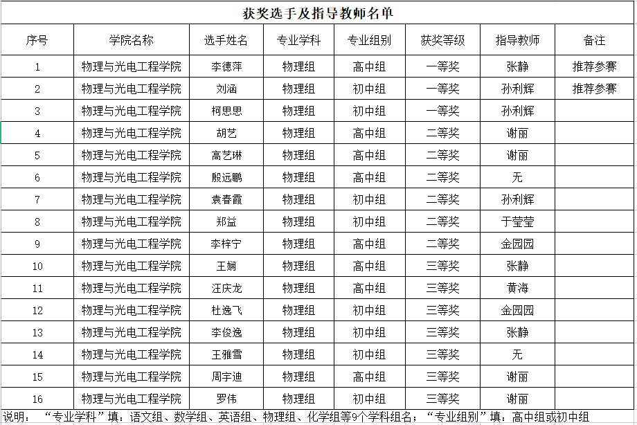 根据《K云体育官方入口举办第十一届湖北省普通高校师范专业大学生教学技能竞赛的通知(第1号)》文件精神和《长江大学K云体育官方入口参加第十一届湖北省普通高校师范专业大学生教学技能竞赛工作方案》,我院进行了物理专业初中组和高中组的教学技能竞赛,现将获奖选手名单予以公示。