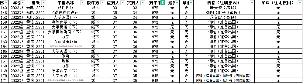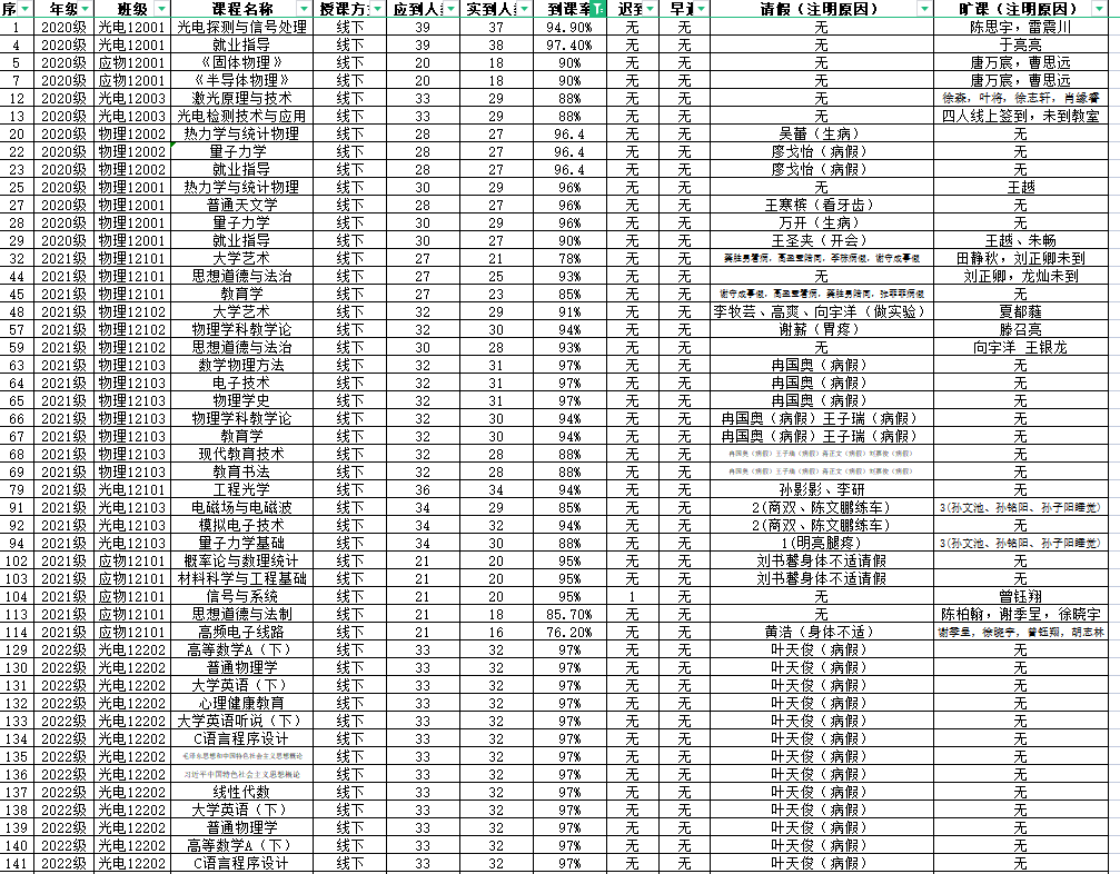 3月13日—3月17日,我院组织学生干部对20、21、22级21个班的43门课程进行了184次课堂考勤,100%到课率119次,现将考勤结果公布如下: