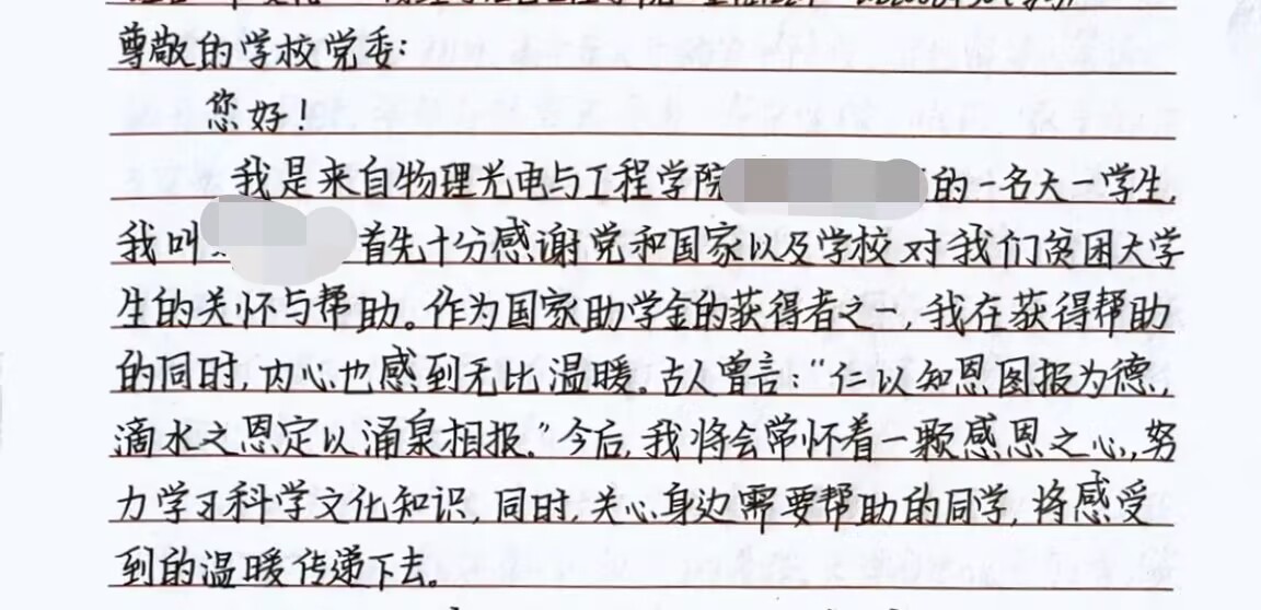 学院倡导受到资助的学生给资助人或学院党委写信,汇报个人成长情况。同学们感激国家助学政策,牢记党和国家的恩情,将所有的感激转化为自己的动力,励志做一名优秀的大学生,用自己的实际行动回馈社会。正如小邓同学在信中引用到:“仁以知恩图报为德,滴水之恩定当涌泉相报”。