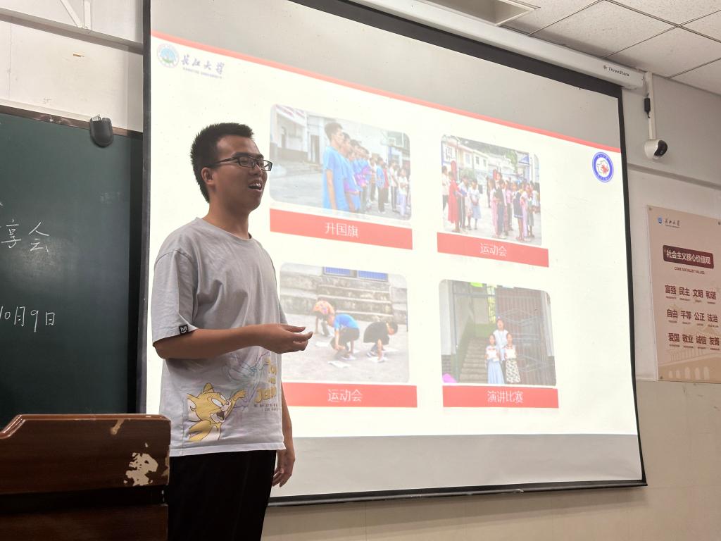 接着,何梁斌分享了在支教过程中特别有感触的小故事和照片,从一开始生活上与交流上的不方便、独特教学方式的不被理解再到和学生孩子们打成一片,“坚持”、“目标”都始终是何梁斌同学身上的关键词,他还说:“前方有责任,后方有自律,自由才丰满,内心才充实”,短短的半小时,何梁斌由内而外所散发的热情深深地感染到了同学们。