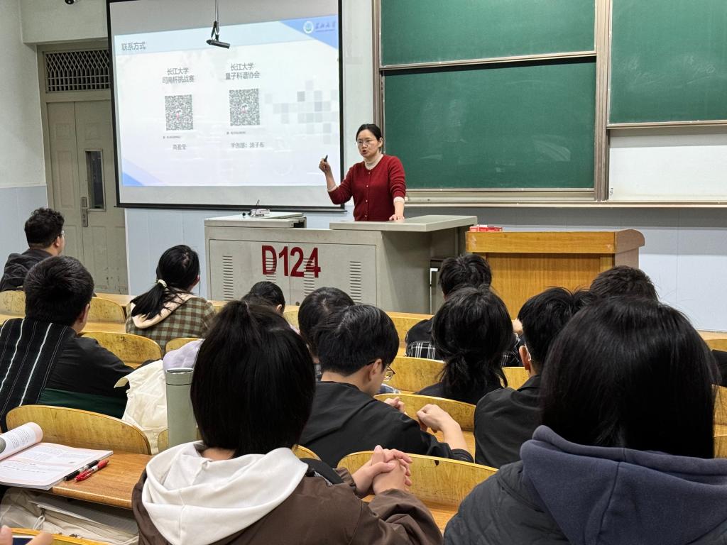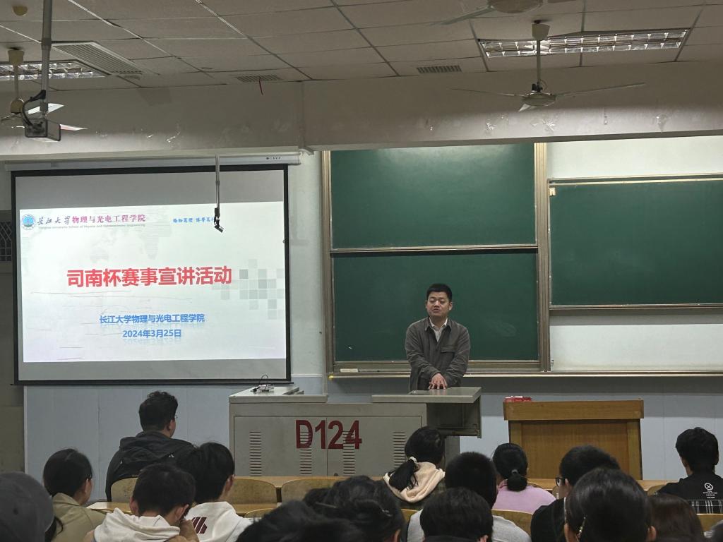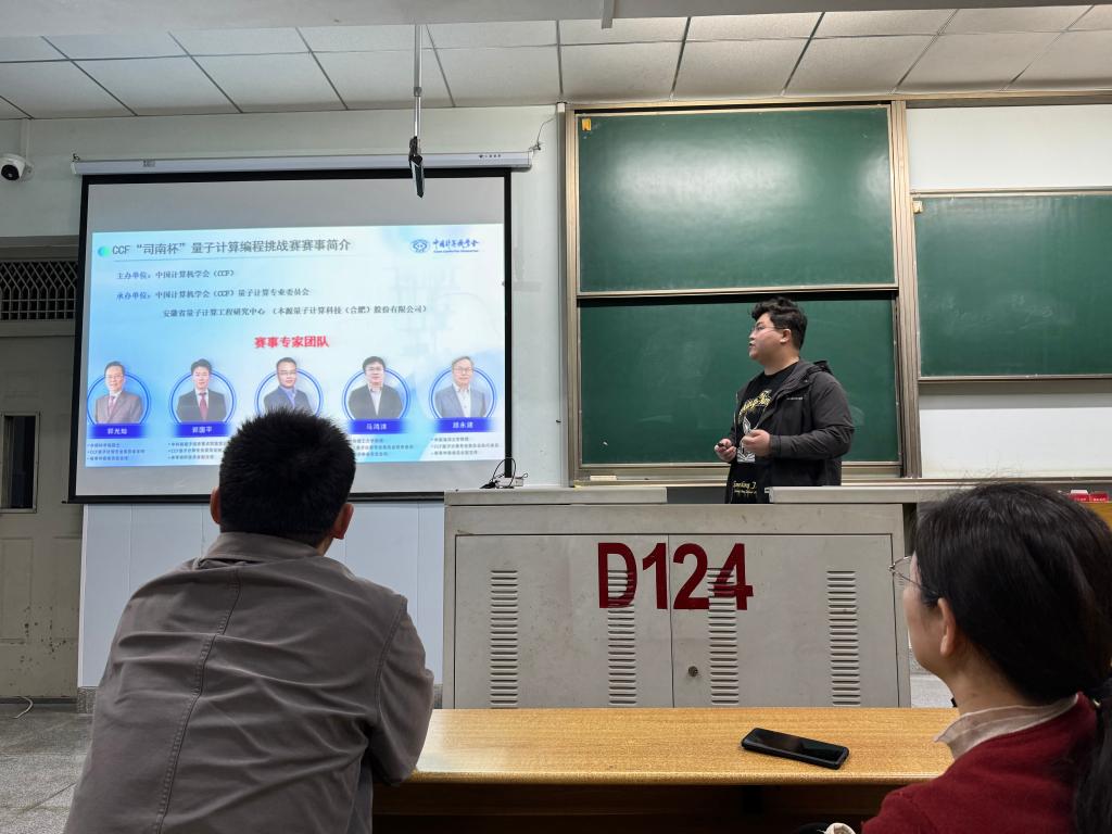 (通讯员:谈睿 闫景烁 摄影:石依郎)为了引导学生积极参加各类竞赛项目,以赛促学、以赛提能,激发学生的学习潜能。3月25日晚七点,学院在13-D-124教室组织开展第三届“司南杯”量子计算编程挑战赛赛事宣讲活动,活动由学院副院长水涛老师主持,学院院长助理姚平老师、量子信息科学专业负责人孙利辉老师,本源量子计算科技股份有限公司代表以及学院大一和大二年级学生参加了此次活动。