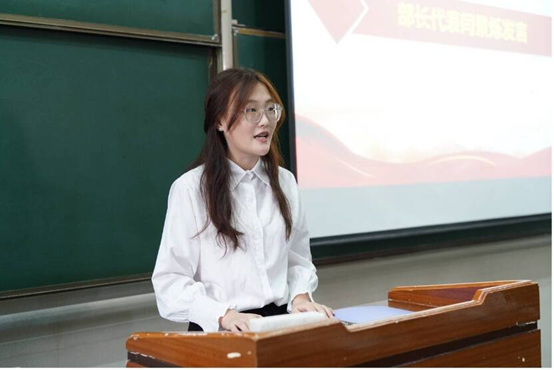 大会第三项由文宣部副部长闫景烁分享自己加入学生会以来的收获与经验。她表示加入学生会以来,分析问题和解决问题的能力有极大地提升,同时期望新成员加强团队合作,培养奉献精神,勇于挑战自我。她最后亲切地说道:“大家来自于不同的专业,不同的班级,但因为共同的目标和理想而走在了一起。这份珍贵的友谊将成为我们人生中最宝贵的财富”
