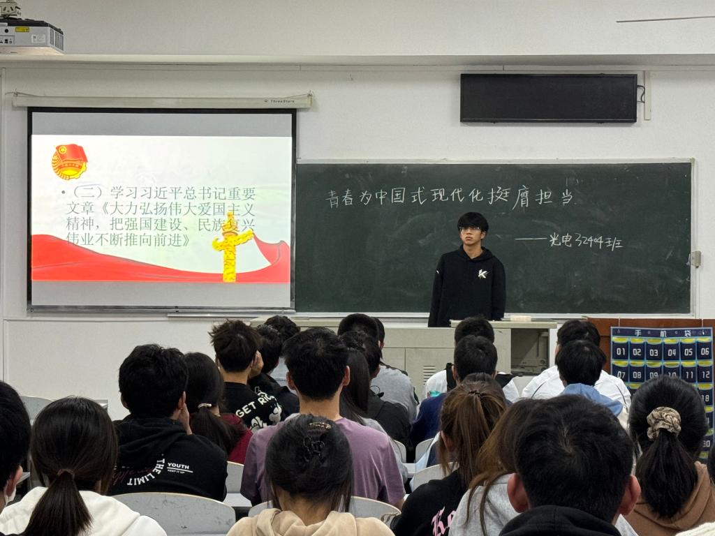 各团支部引导同学们在习近平总书记重要文章中学精神、悟思想、践行动,切实增强青年学子的中国特色社会主义道路自信、理论自信、制度自信、文化自信,夯实团员青年爱党爱国爱社会主义的思想根基,使爱国报国成为团员青年的坚定信念、精神力量和自觉行动。