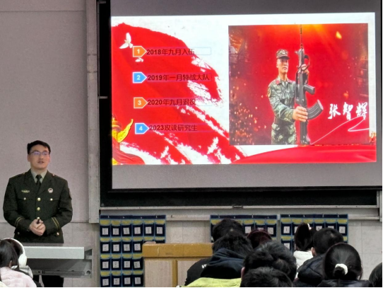 张智辉同学也为大家介绍了今年的征兵政策和应征条件。他特别提到今年报考军校和文职人员的政策有所调整,并鼓励同学们积极踊跃报名,实现从学生到军人的蜕变。