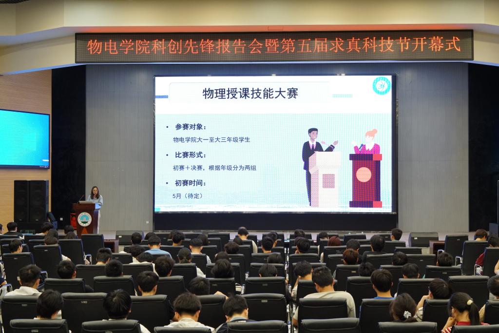 (通讯员:刘瑞琴 摄影:梁传蔚)4月23日晚七点,物理与光电工程学院在西校区农科大楼报告厅迎来一场智慧与创新的盛会——科创先锋报告会暨第五届求真科技节开幕式隆重举行。参加活动的有院长助理姚平、团委书记张兵、一年级辅导员周港、学生代表及全体大一年级学生,活动由周港老师主持。